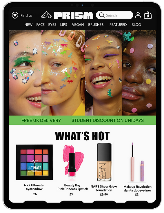 To enhance my website design skills, I took on the task of designing a website for a fictional online marketplace called 'Prism'. This platform allows shoppers to browse and purchase from a wide range of top and trendy makeup brands from around the world.